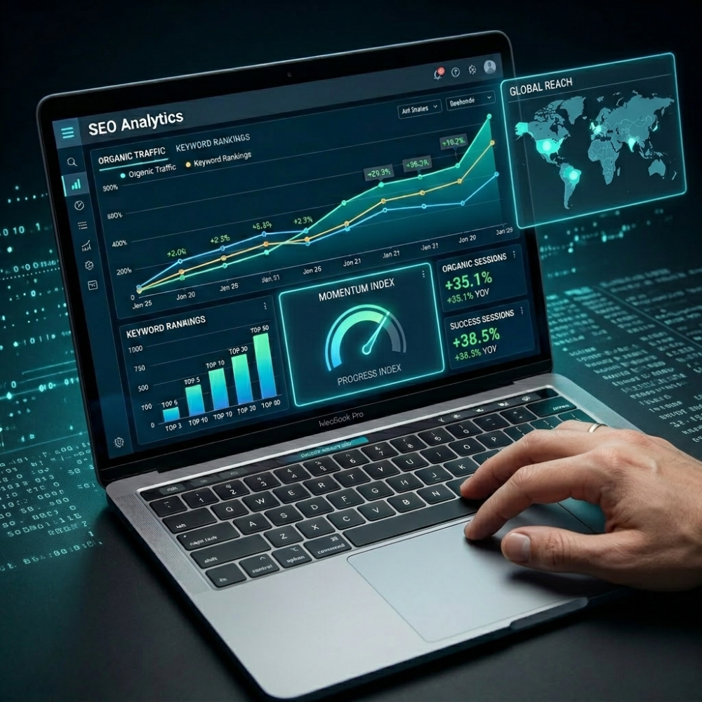 SEO requires consistency, so we monitor rankings, refine content, build authority, and continuously optimize performance to protect visibility and compound organic traffic growth monthly.